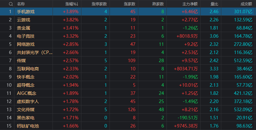 今日领涨板块是游戏,贵金属、CPO、传媒。
