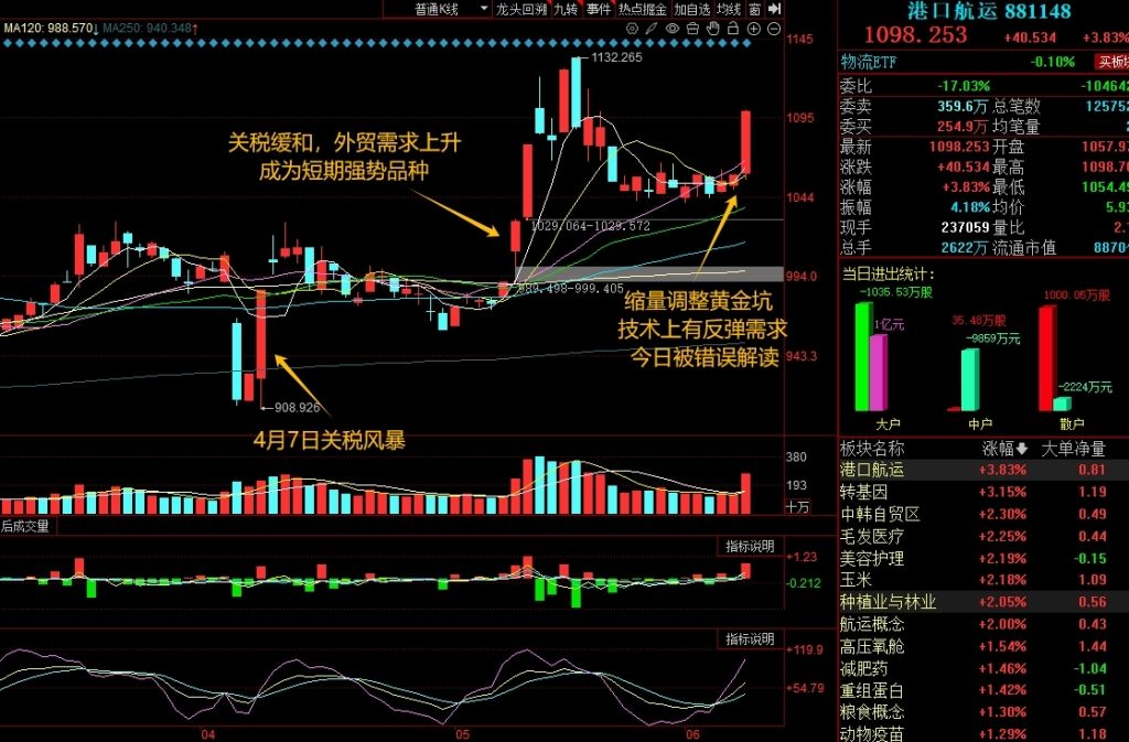 从技术上来看,港口航运这个板块,已经形成了调整黄金坑,5日线与10日线粘合,本身就有反弹需求,午后异动一下再正常不过。结果说者无心,听者有意,恰逢中美在伦敦谈判这个敏感时间节点,这一下异动,歪曲了市场想法,觉得是不是谈判又出什么问题了。然后资金开始疯狂往港口航运怼,进不去港口的,退而求次,赶紧去怼农业板块。紧接着,谈崩了这个信念被无端强化,引发恐慌跳水,跟风踩踏。