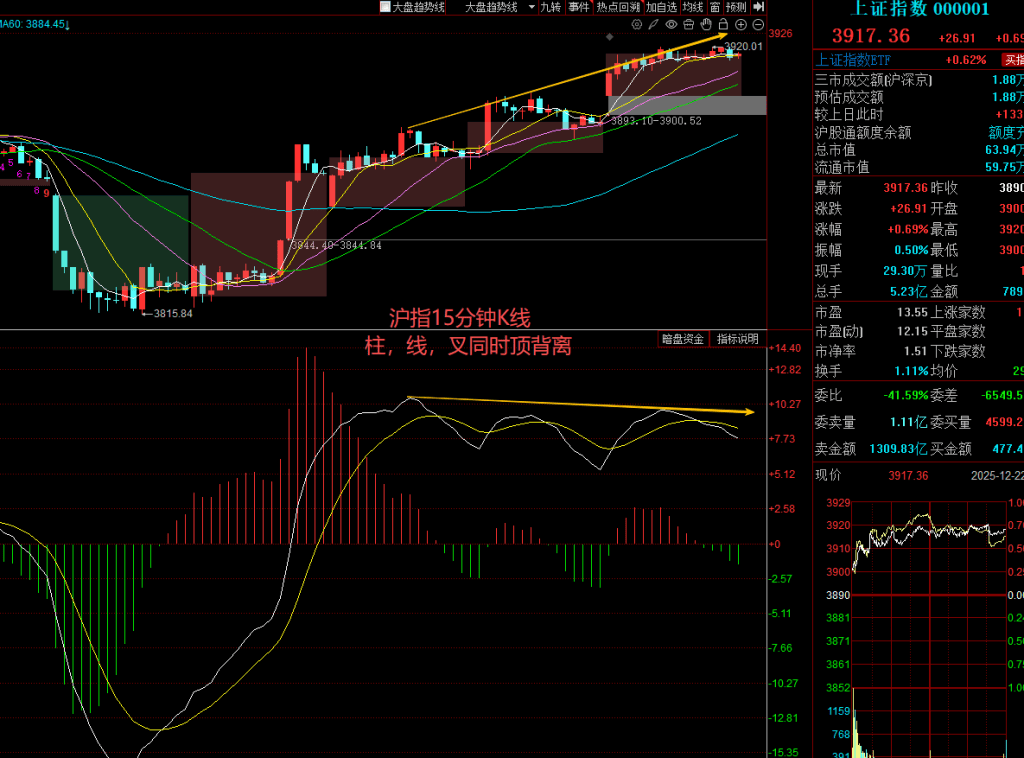 沪指15分钟K线的MACD,出现了柱、线、叉的同时顶背离,背离级别不大,也足以引发调整。由于大趋势依然健康,所以这种调整我们可以视为突破前的回踩蓄力。大趋势不变的情况下,小周期出现反向走势,往往是买入信号。30分钟和60分钟的压力位3890也已经突破,所以如果想动手买入的话,建议大家耐心等调整,把买点放到回踩3880-3890区间之时再考虑动手。