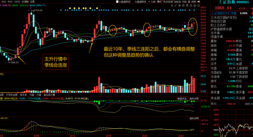 今天放量了5000亿,全天呈现温和动态放量的节奏,指数涨得也不算太急。说明现在假期即便是外面大涨,A股也显得比较理性。这种状态也表示,经过了1年多的磨砺,924行情之后入场的新股民,开始趋于成熟,这将在今年有效减少市场的非理性波动,有望令市场在未来走得更加平稳。不过客观理性的说,全天成交量已经回到2.5万亿上方,3万亿并非不可能,但需要时间,想要继续像今天这种大幅动态放量,很难。毕竟不管是谁,看到这种罕见的连阳状态,都会打退堂鼓,追涨情绪也会慢慢减弱,市场就会呈现走走停停的状态。
