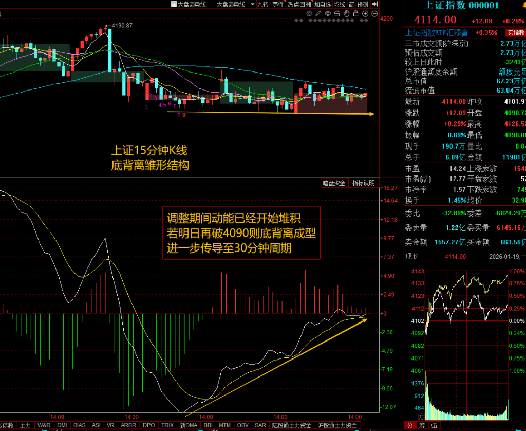 技术上来看,沪指的15分钟级别上,出现了底背离雏形结构,横盘期间MACD一直在不断累积动能。若再次盘中击穿4090,则底背离宣告成型,将会进一步传导至30分钟形成底背离。接下来无论是做T,还是开新仓,都建议大家在指数回踩4090附近或者下方的时候再动手。
