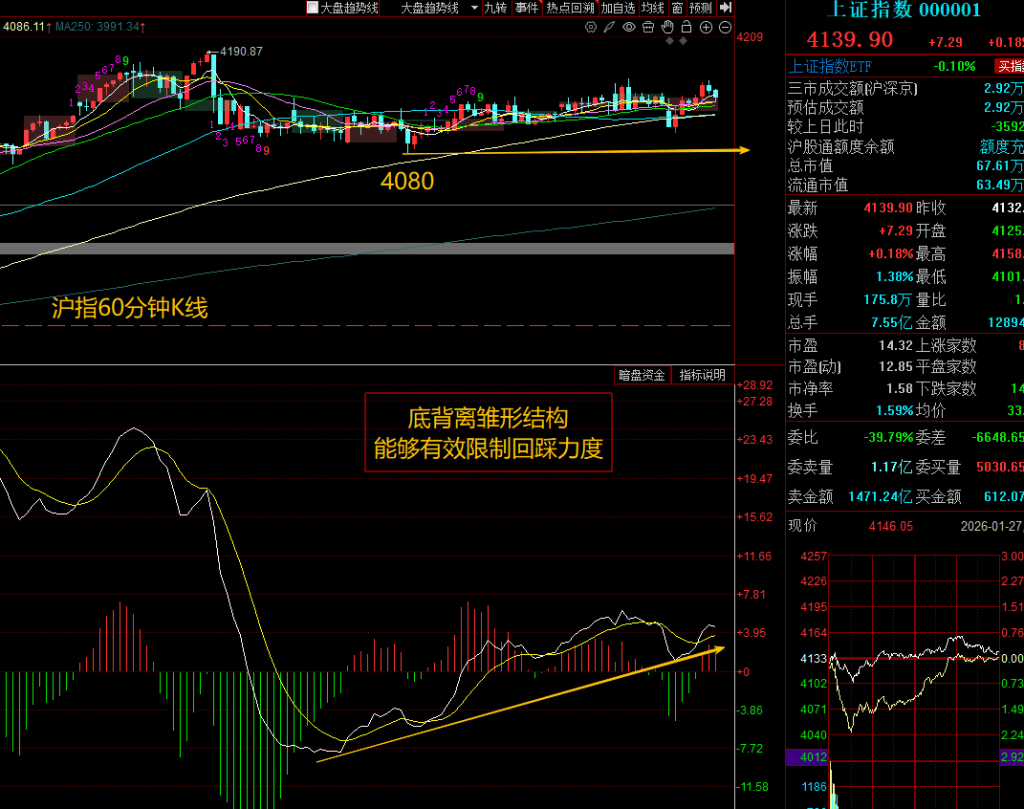 来看沪指60分钟图形,之前30分钟的底背离结构已经延伸到60分钟级别,形成了雏形,所以如果真的指数还要继续回踩,那就直接会触发30分钟和60分钟的底背离共振。这个结构能够有效限制指数的回踩力度,从目前技术上表现的状态来看,我们预计很难有进一步回踩,因此这个底背离可能不大会能够成型。
