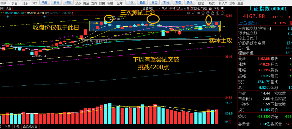 这说明,经过这两个月反复上攻4170-4190区域之后,抛压已经大大减轻,今日能以实体靠拢上沿,意味着下周突破的概率大大增加,只要再次放量到3万亿左右,就能够轻松突破。根据箱体突破测算标准,一旦4200点有效突破之后,下一个目标我们就可以看到4300点附近。所以现在我们要做的,就是屏住呼吸,减少折腾,静静等风来!