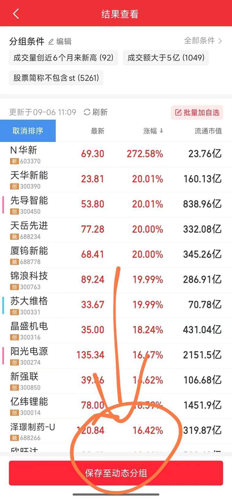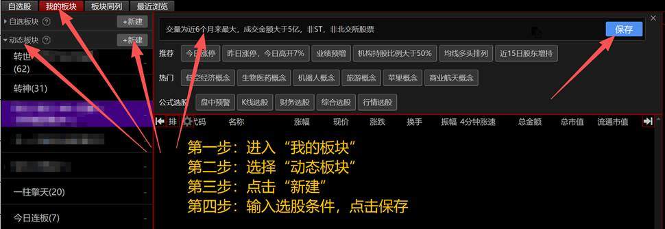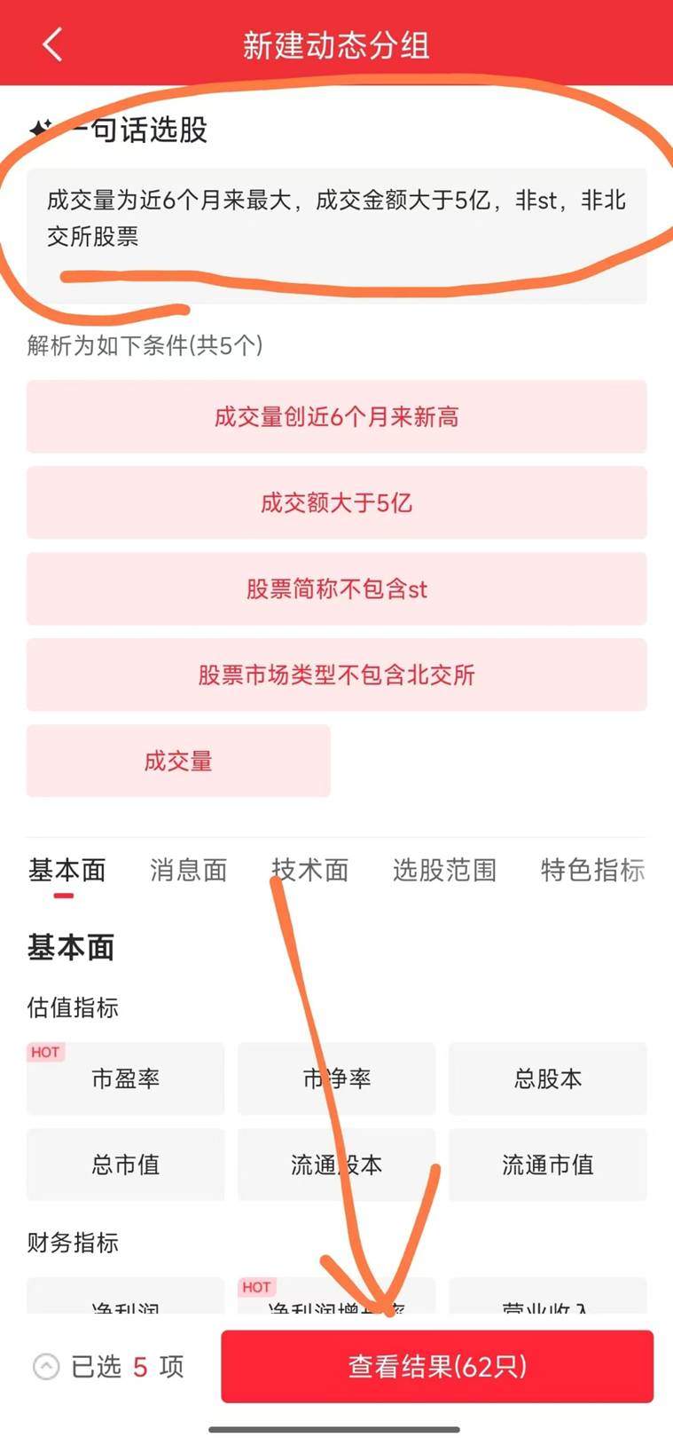 第三步:输入筛选条件:成交量为近6个月来最大,成交金额大于5亿,非ST,非北交所股票,并点击查看结果,并保存至动态板块。