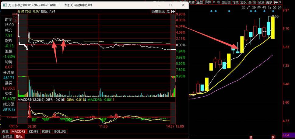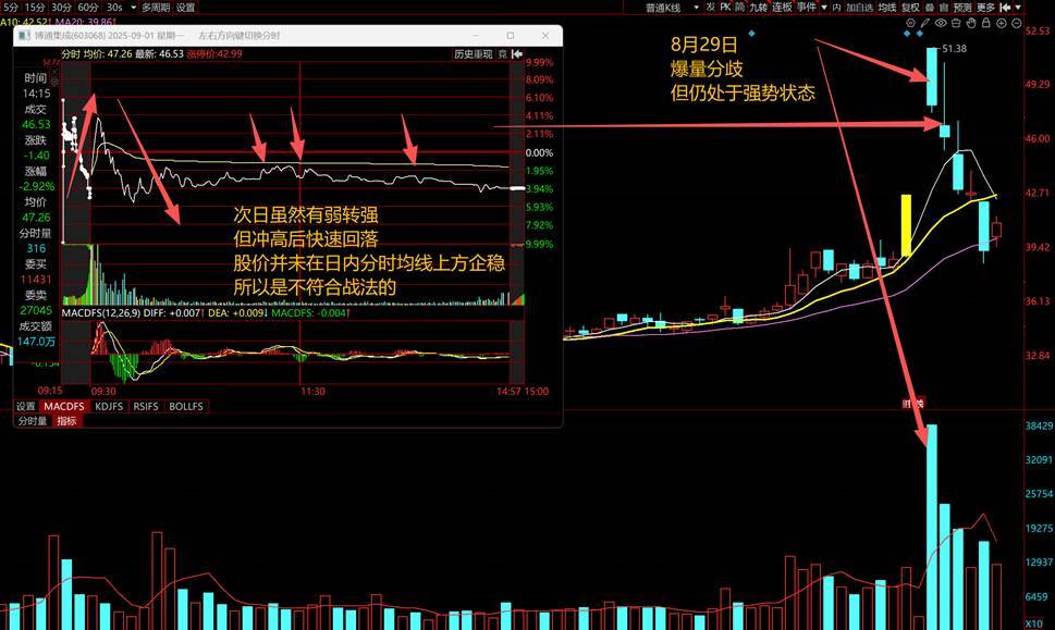 8月29日,爆量分歧,但仍处于强趋势的状态,有反包涨停的概率。但次日的实际走势是,早盘弱转强,冲高往上。