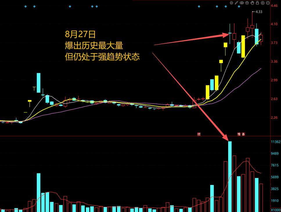 8月27日,放出历史最大量能,但整体趋势很好,当时低价股正在启动期,低价属性是一条暗线。