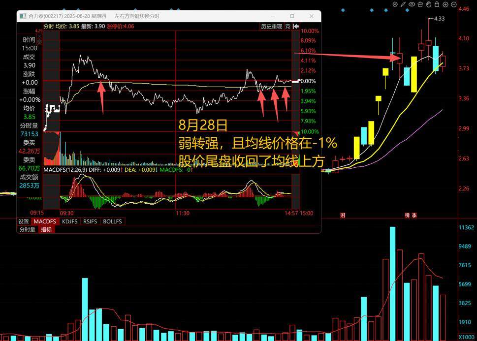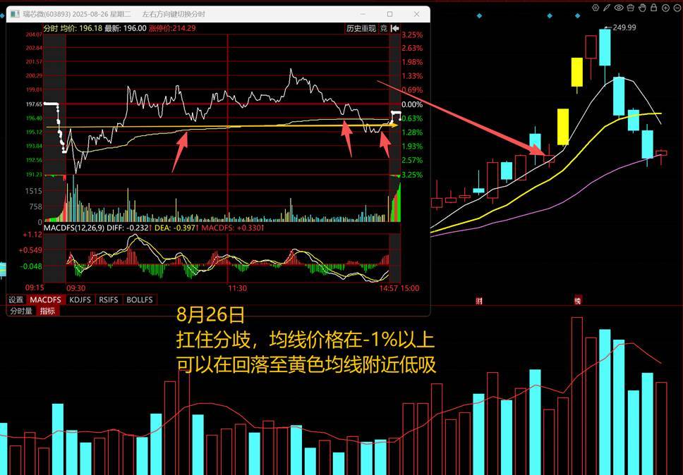 8月26日,扛住了资金的抛压,日内分时均线(黄线)处于-1%以上,且,股价全天维持在均线上方,因此,可以考虑在股价回落至均线附近进行低吸。