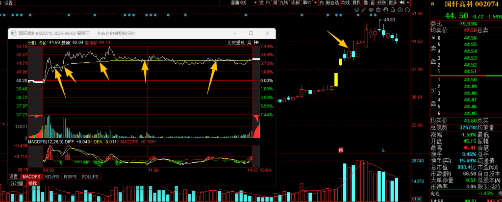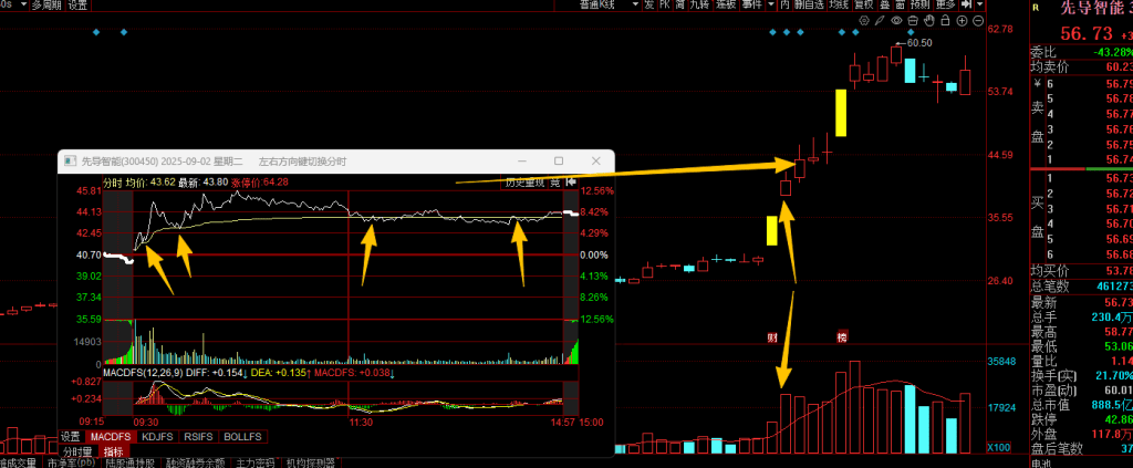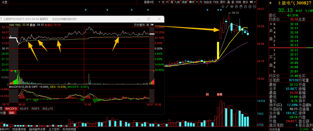 9月3日超预期小高开,开盘后立即拉升往上,超预期,符合转世战法介入条件。后续回落到均线附近,可以考虑低吸。