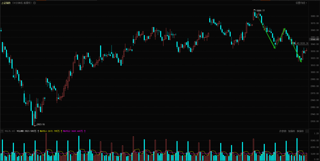 【技术分析】上证指数30分钟级别从10月23日2923点开始反弹反弹,到11月21日3089点完成了一波完整的5浪反弹结构,3089点是5浪延伸,反弹浪走完之后开始走ABC浪调整结构,今天盘中小C浪已经杀完了,短期会迎来一个关键变盘点,要看低点3015点会不会还要跌破,这里理想的走势是不破今天低点震荡回升,重新回到震荡上扬结构来,希望关键节点别再有捣乱的。