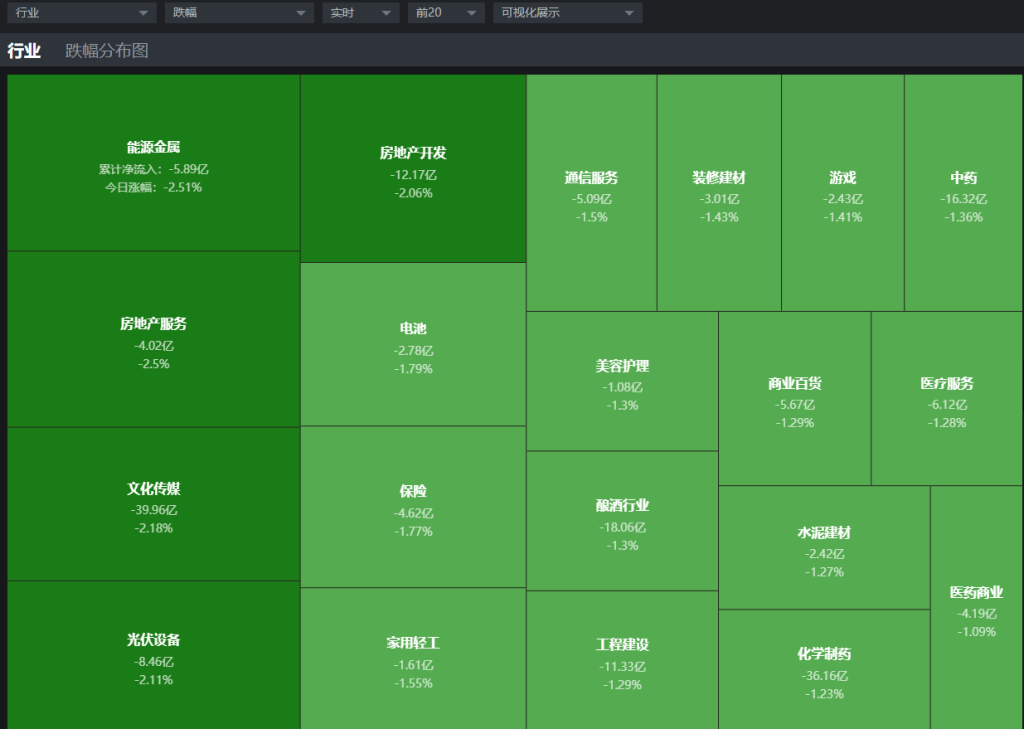 板块跌幅榜来看,能源金属、房地产服务、文化传媒、光伏设备、房地产开发、电池、保险等,跌幅第一的又是能源金属,碳酸锂期货今天逼近跌停,相关板块也是集体下行,目前处于空头趋势当中,不易盲目抄底。另外就是保险板块,保险几只龙头遭遇利空因素之后整个板块伤了元气,形成下降结构,目前依然在下降趋势之内,尚未出现止跌的信号。