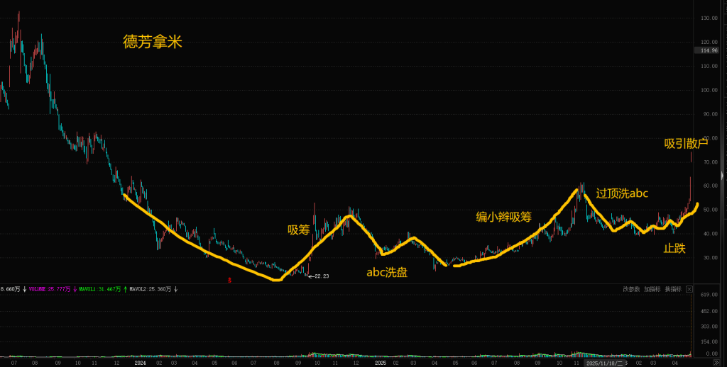 德芳这又是一次教科书级别的筹码搬运。1主力第一轮暴力吸筹然后abc洗盘,2第二轮编小辫吸筹过顶洗abc洗盘,3编小辫控盘创新高打榜吸引散户跟风