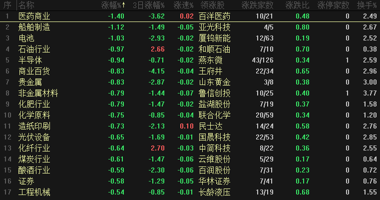 今日板块跌幅靠前的是医药商业、船舶制造、电池、石油行业、半导体、商业百货、贵金属、非金属材料、化肥行业和化学原料等,当前来看板块整体风险并不大,当前主要风险还是涨幅较大的个股需要进行风险释放,包括医药商业的鹭燕、合富,商业百货几只涨幅较大的都开始出现调整。而证券和保险早盘还是想要向上顶指数、但是盘中都开始调整,也可以看出多方力量开始衰竭,最后依靠三桶油、房地产等少数几个权重苦苦支撑。