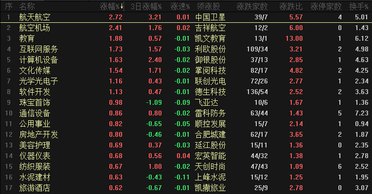 【热点板块】今日行业涨幅靠前的是航天航空、航空机场、教育、互联网服务、计算机设备、文化传媒、光学光电子、软件开发、珠宝首饰和通信设备等。四维分析来看,行业板块有43个上涨,其中有2个板块涨幅超过2%,下跌板块也是43个,个股方面,两市上涨家数是2474家,涨停63家,下跌家数是2776家,跌停12家。盘面整体来看,板块和个股涨跌比维持1:1的状态,回顾全年的行情板块和个股分化也是非常明显的,有一大批个股全年涨幅是跑输大盘的,收益不理想最重要的就是没有选对主线,今年表现较好的是军工、机器人、科技和金属等,那明年主线在哪?其实近期的盘面已经给出答案了,十五五规划课程和复盘已经多次提示了,并且已经有资金提前布局明年的主线了,包括今天盘面也是这类板块走势较强,消费、科技、军工和机器人等这几条主线依然是可以继续关注的,大金融板块现在已经是战略板块了、主要是控制指数节奏,具备想象空间的就是这几条主线。