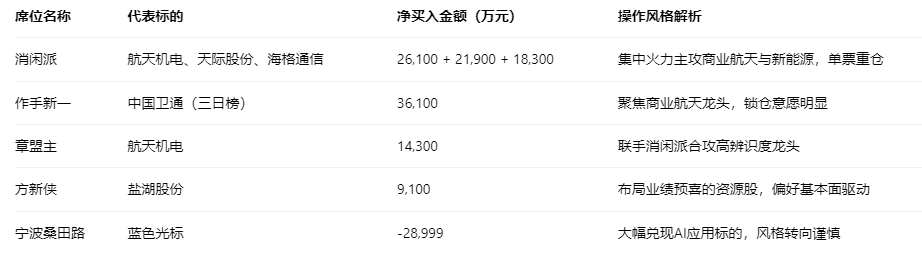 风格差异:消闲派、章盟主偏向进攻性的板块龙头打法;作手新一擅长趋势持股;方新侠更注重基本面与估值的安全边际;宁波桑田路则体现了典型的短线获利了结思维。