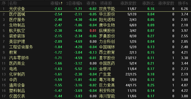 今日板块跌幅靠前的是光伏设备、医疗器械、医疗服务、生物制品、航天航空、装修装饰、美容护理、工程咨询服务和教育等,资源板块持续火爆、短线资金都扎堆进入资源板块,而其他板块资金都是流出的状态,特别是涨幅较大的板块资金呈现大幅流出状态,同时要注意跌停家数还有28家,个股风险还在继续释放,很多都是在高位出现破位长阴线、这类个股一定要注意短期风险。