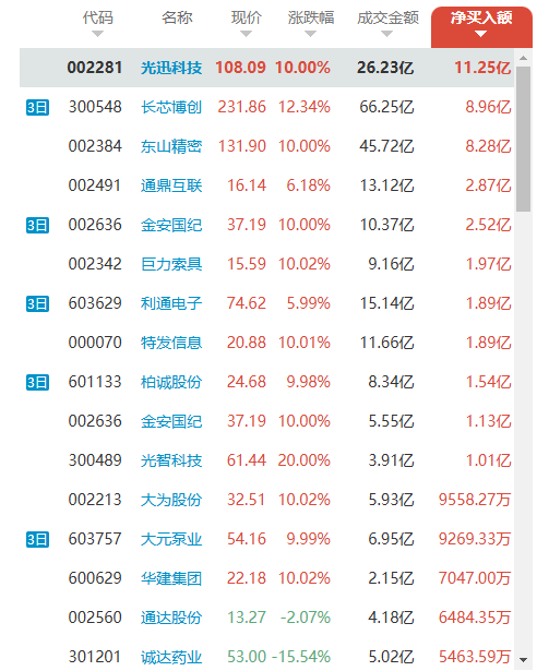 从净买入额看,光迅科技(11.25 亿)、长芯博创(8.96 亿)、东山精密(8.28 亿) 占据前三,合计净买入超 28.49 亿,占榜单前 10 名净买入总额的 78% 以上,资金向 “大市值 + 高成长 + 算力核心” 标的集中的特征达到极致。