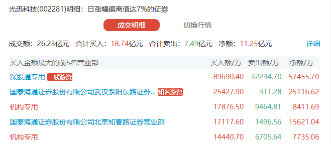 1. 一线打板游资(代表:光迅科技、东山精密买一席位)