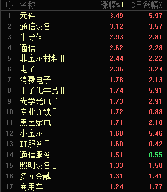 【热点板块】今日行业板块涨幅靠前的是元件、通信设备、半导体、通信、非金属材料、电子、消费电子、电子化学品、光学光电子和专业连锁等。四维分析来看,行业板块有89个上涨,其中有6个板块涨幅超过2%,下跌板块有68个。个股方面,两市上涨家数2920家,涨停63家,下跌家数2433家,跌停15家。