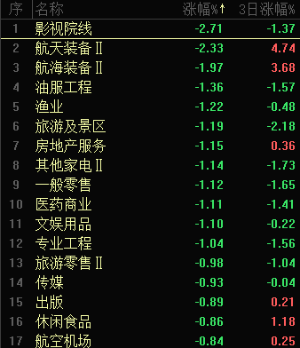 今日板块跌幅靠前的是影视院线、航天装备、航海装备、油服工程、渔业、旅游及景区、房地产服务、其他家电、一般零售和医药商业等。军工全线上涨之后,开始出现调整,但中长期依然还有机会,几条主线是处于轮动状态。消费板块也是跌幅靠前,旅游、家电和商业等也是表现疲软,板块整体风险不大,主要风险还是集中在个股。