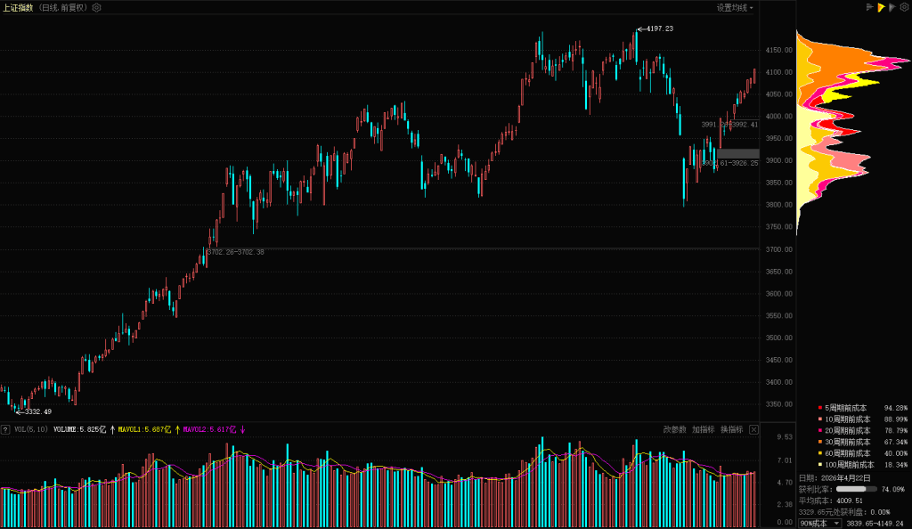 【技术分析】上证指数再次形成一波三连阳,近12个交易日收出了10颗阳线,中间还有一波5连阳。采取的方式是编小辫子的方式逐步冲击阻力位,这个走势也是符合预期的。编小辫子是主力资金最喜欢的一种方式,最大的优点是不需要持续放量,所以本轮反弹成交量基本是持平状态,没有明显的放量。目前指数已经进入到4100-4200点压力区域,筹码分布来看,收盘位置已经触及到筹码峰区域,开始处理大量的套牢盘。怎么处理呢?日线来看,大概率还会维持当前反弹节奏,但是在分时和小周期可能会出现洗盘的动作,也不排除会用低开、或者开盘快速下探来完成洗盘。今天低开其实也是洗盘的动作,下一个阶段可能会反复用这种方式来消化套牢盘筹码。技术走势来看,30分钟和60分钟等小周期还是处于反弹趋势之中,没有出现破位信号。