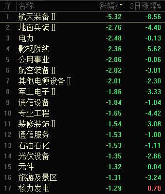 今日板块跌幅靠前的是航天装备、地面兵装、电力、影视院线、公用事业、航空装备、电源设备、军工电子、通信设备和专业工程等。军工板块集体出现调整,跌幅较大的是商业航天方向,因为这个板块前期主升浪已经结束,没有太大反弹空间。而军工板块还有一些低位个股未来还是存在机会的,军工板块中长期还是值得继续跟踪。