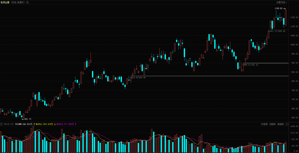盘面整体来看,上涨家数下降到2000家左右,而跌停家数已经增加到37家,个股风险开始释放,盘口呈现弱势状态。板块来看,能源金属板块一枝独秀,涨幅超过7%。整个金属板块分化非常明显,有色金属反弹到阻力位开出中阴线,今天是弱反抽;而能源金属板块是创出历史新高之后,出现过顶洗,这是强势洗盘,随后再次创出新高。能源金属这次是和电池联动的,而其他几条中长期主线半导体、电子化学品等表现也是较为强势,所以板块还是需要围绕这几个板块展开。