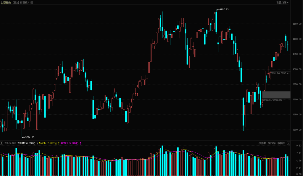 上证指数从4114点形成小周期的调整走势。30分钟结构来看,第一次下探到20日均线出现反抽,今天是下探到60日均线附近获得支撑,再次小幅反弹,形成30分钟级别的ABC调整。日线来看,下方有10日和60日均线双重支撑,所以4050点上方是有较强支撑的。短期来看,还会在这个区域反复震荡、洗盘。向上面临4100-4150点套牢盘区域,没有重大利好刺激的情况下很难直接突破;向下日线、周线和月线也有多重技术支撑位,多方也会在关键区域进行防守,所以向下连续大幅杀跌概率也很小。持续震荡消化是目前最合理的方式。创业板小周期走势和大盘是同步的,也是形成ABC调整结构,但是创业板周线收出一颗带长上影线的阴K线,这颗K线需要注意,这是降成本的信号。