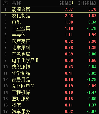 今日行业板块涨幅靠前的是能源金属、农化制品、电池、工业金属、半导体、医疗美容、化学原料、有色金属、电子化学品和纺织服装等。四维分析来看,行业板块有17个上涨,其中有2个板块涨幅超过2%,下跌板块达到78个,个股方面,两市上涨家数2036家,涨停68家,下跌家数3352家,跌停37家。